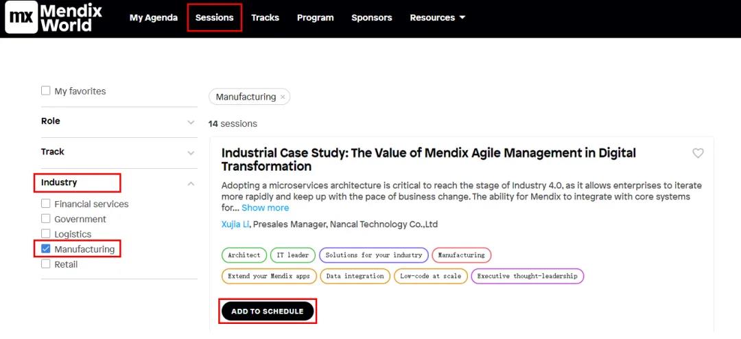 您完成注册登录后,可选择“Sessions(会话)——Industry(行业)——Manufacturing(制造业)”,在课题列表中找到能科股份讲师的课题,点击“ADD TO SCHEDULE”提前添加至您的个人时间表中,届时方便与我们进行沟通交流。